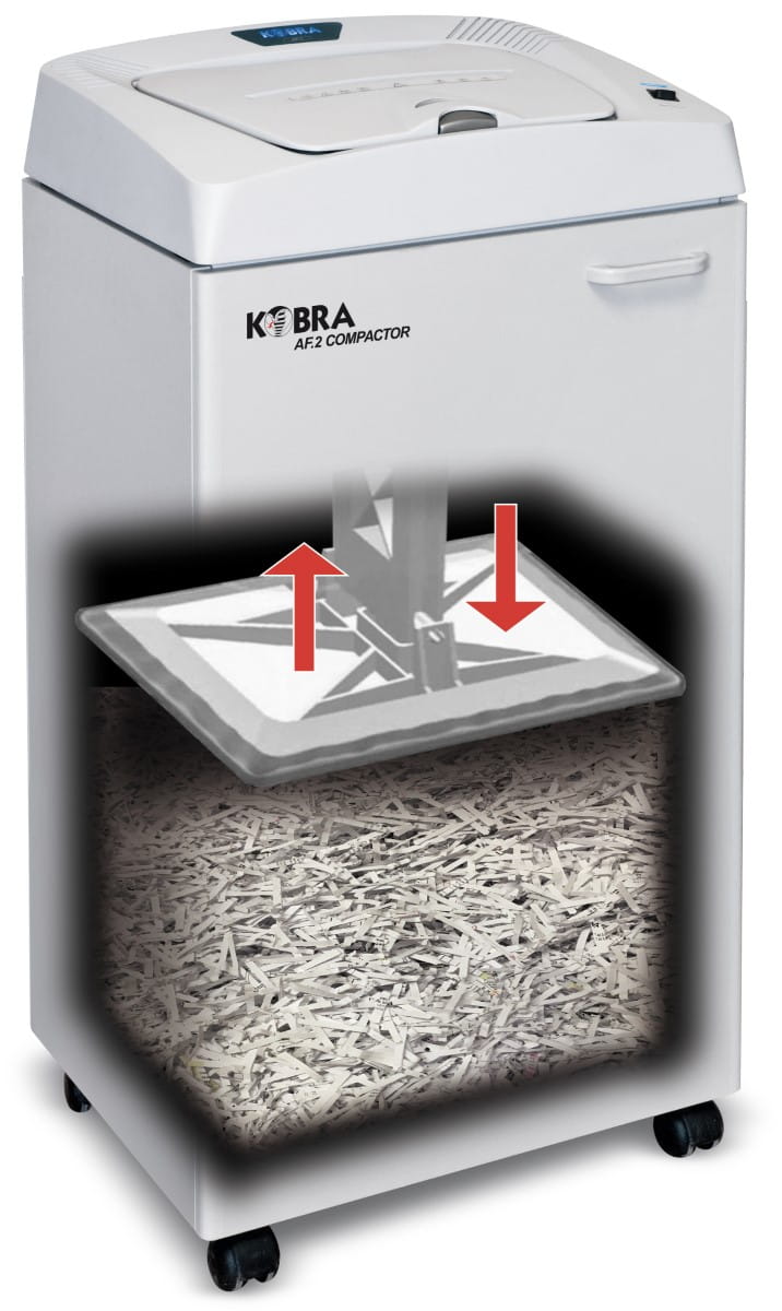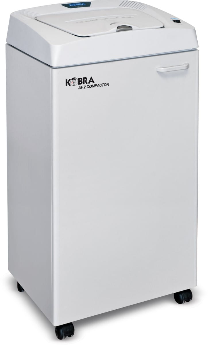 Kobra AF.2 posiada szufladę-podajnik papieru na 400 kartek oraz osobną szczelinę do ręcznego niszczenia dokumentów. Specjalny system kompaktowania, czterokrotnie redukuje objętość ścinek optymalizując pojemność kosza ze 150 do 600 litrów, co ogranicza ilość opróżnień worka. Wielkość kosza i nieprawdopodobna prędkość niszczenia, 37 kartek na minutę, pozwala szybko zniszczyć dużą ilość dokumentów.