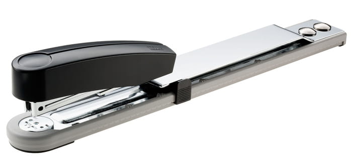 Profesjonalny i elegancki zszywacz długoramienny do akt, z metalowym mechanizmem w plastikowej obudowie.