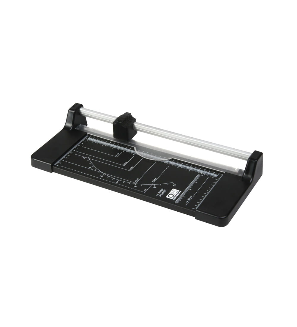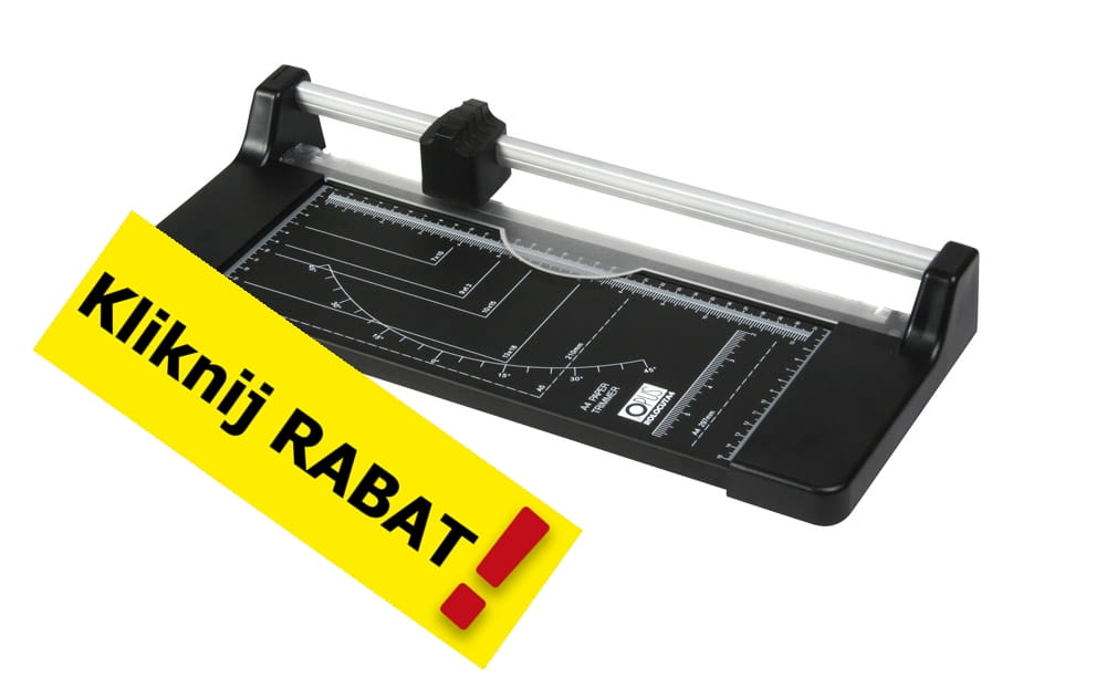 Trymer krążkowy do papieru max formatu A4. Blat roboczy z bardzo czytelnym szablonem formatów i podziałką milimetrową. Posiada plastikową listwę docisku.