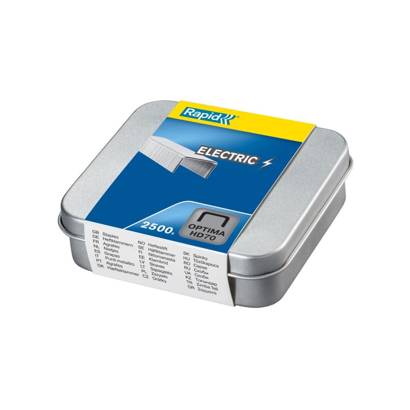 Wysokiej jakości zszywki Optima HD70 przeznaczone do zszywaczy elektrycznych Optima 45 i Optima 70 pakowane są w aluminiowe pojemniki z wieczkiem po 2.500 sztuk.